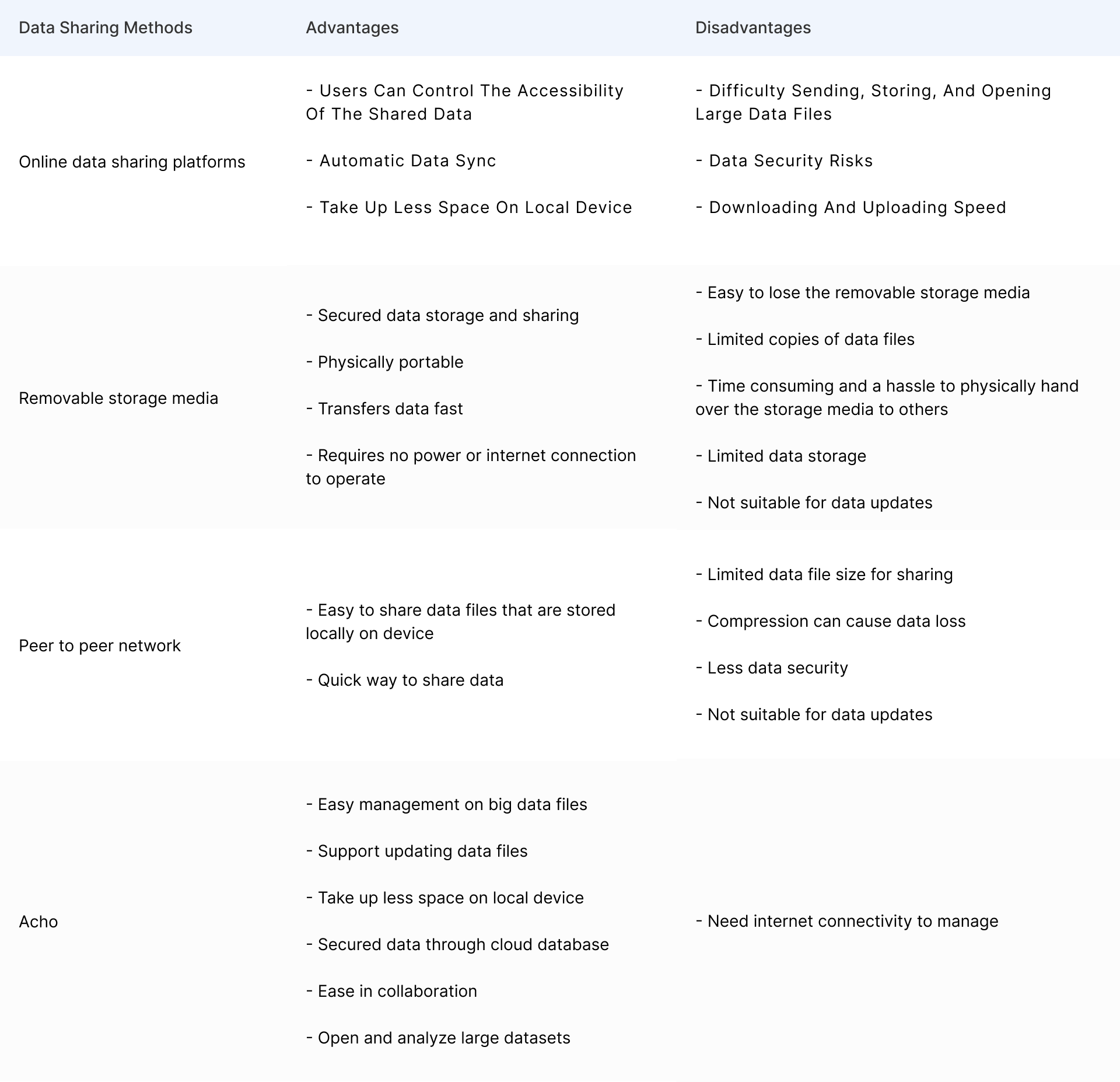 The last method that we wanted to mention is the use of cloud database management platforms to store and share data. An example of such a platform would be Acho. These platforms are built on cloud, so they can utilize cloud computing to process big data very fast. In addition to storing and sharing data, these platforms allow recipients to open and analyze the large data files. Although the previous three methods can send big data files to someone effectively, their recipients need to find other tools to open the file if the size of the file exceeds the limit that spreadsheet programs can support. However, cloud DB management platforms support viewing and analyzing large datasets, and allow multiple users to collaborate on the same data as well.