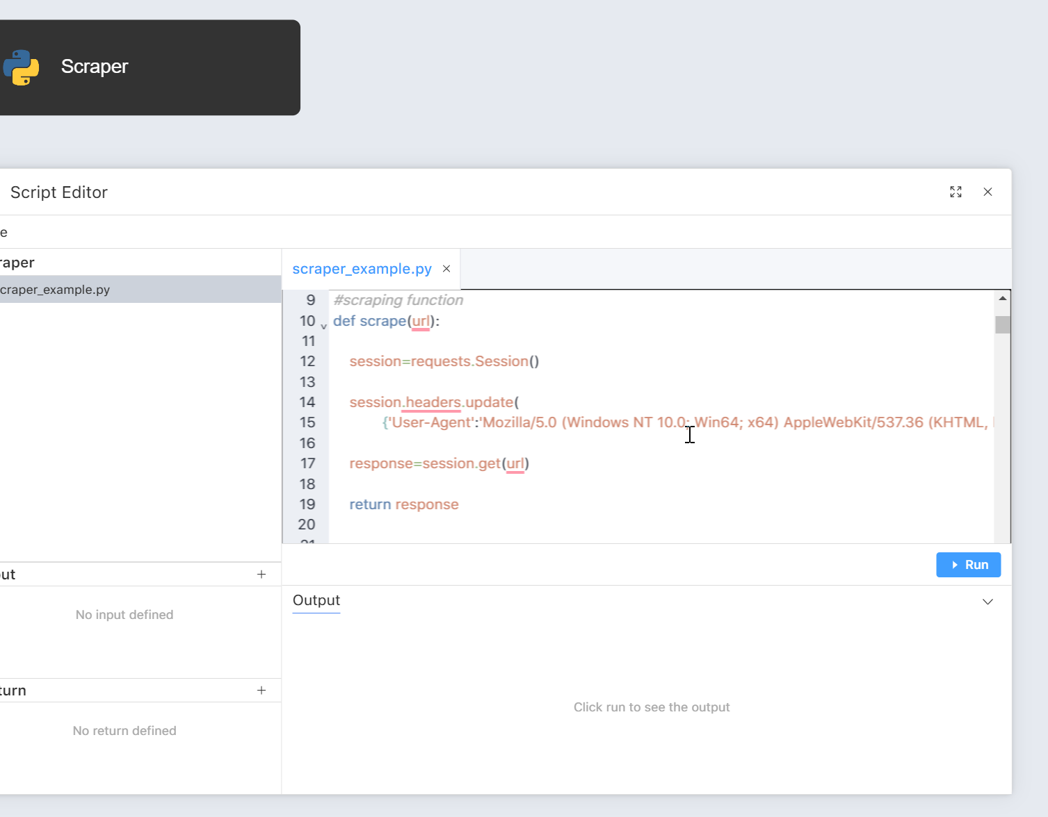 Once finishing your scraper script, you can find a tool, such as Acho, to host your scraper script on a server. This step ensures that your scraper is always running and collecting data, even if your computer is turned off. Moreover, running a scraper may require high computing power, and hosting it on a dedicated server is faster and more efficient. On Acho, you can drag a script node, such as a Python node, from the right Create panel and upload your script within the script node. Another way is to use Acho SDK to deploy your scraper to Acho.