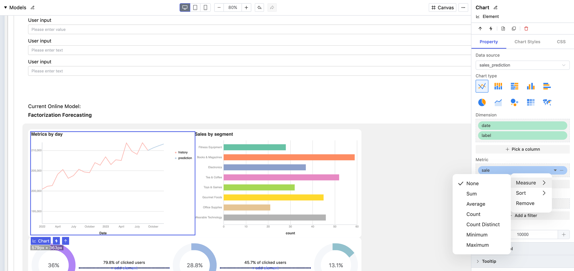 Next, you can create an interface within the low-code environment. Here, you can visualize the model output and build interactions to collect user input. There are plenty of templatized elements and charts available for use. Low-code environment makes adding and arranging components as simple as drag-and-drop. At the same time, you retain full customization capabilities for the logic in the interactions. You can even add a button to send the model output by email or issue a Slack alert, or add interpretation and analysis to the model output... almost anything you can think of. Consequently, you'll maximize the utilization of your machine learning model and ensure that your users get benefits from the model.