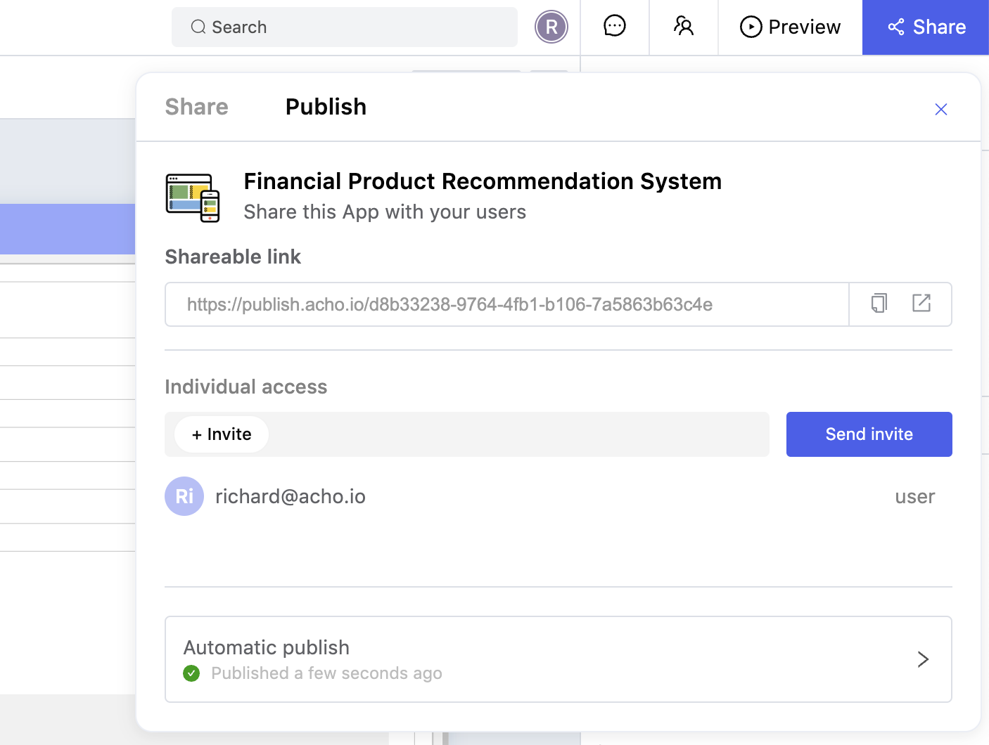 After you have built out the interface, you can publish the application and share it with your team. Users will receive an email guiding them on how to log into your app. They can also participate in collaboration, dropping comments to aid in the app iteration. Getting users involved in the development process is very effective; it typically accelerates the development pace and yields better utilization.