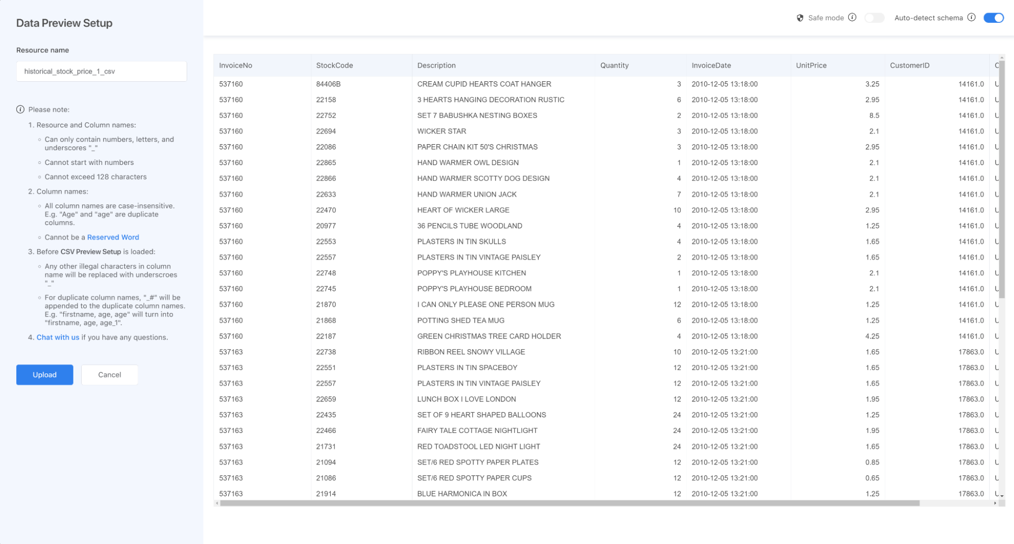 If they all have the same column name and correct values for each column, you should see a preview page with a sample of your files like this. (Note: If all of your files don’t have a header row, remember to switch to “Safe Mode” to add a header)