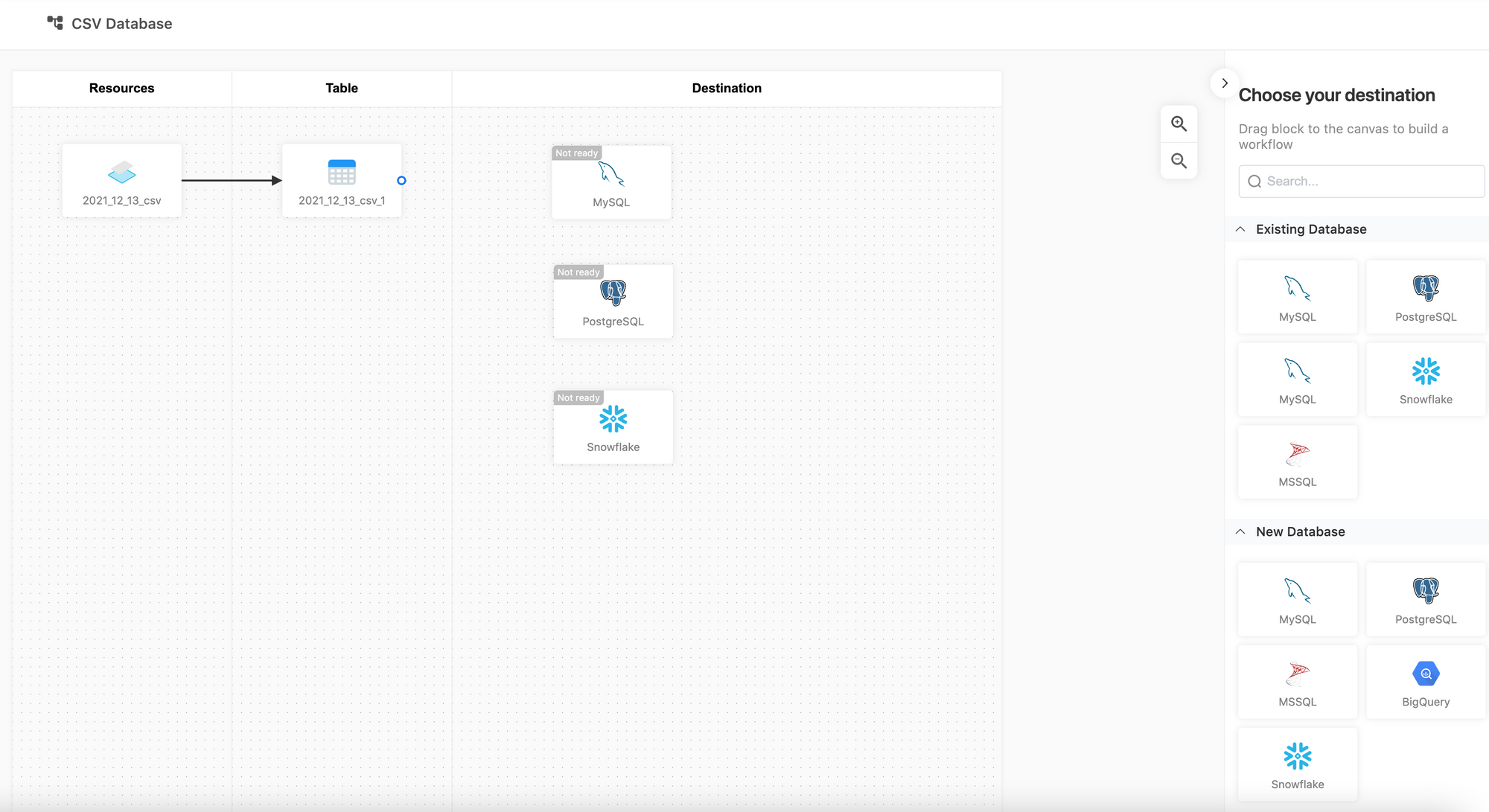 Once the data is imported and built out in the project table, you can use the "Workflow" feature to export the table to a production database such as MySQL, PostgreSQL, BigQuery, and more. By verifying the credentials, you can write the table data to the database automatically.