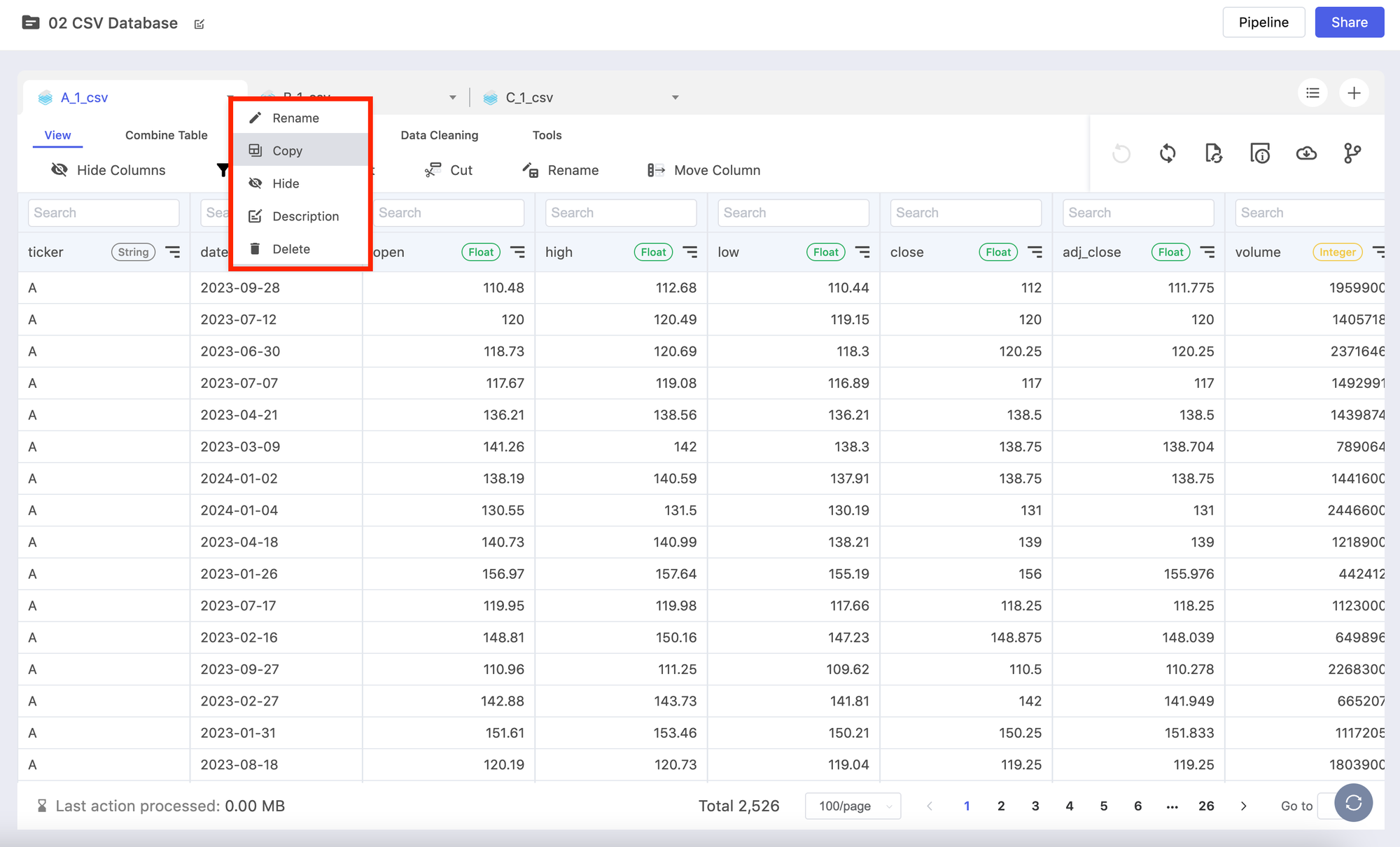 This step is crucial if you want to combine the CSV batches of different schema. By "copying" one of the existing tables as a "Master Table" with a pipeline, you can now "connect" the subsidiary tables with the Master Table.