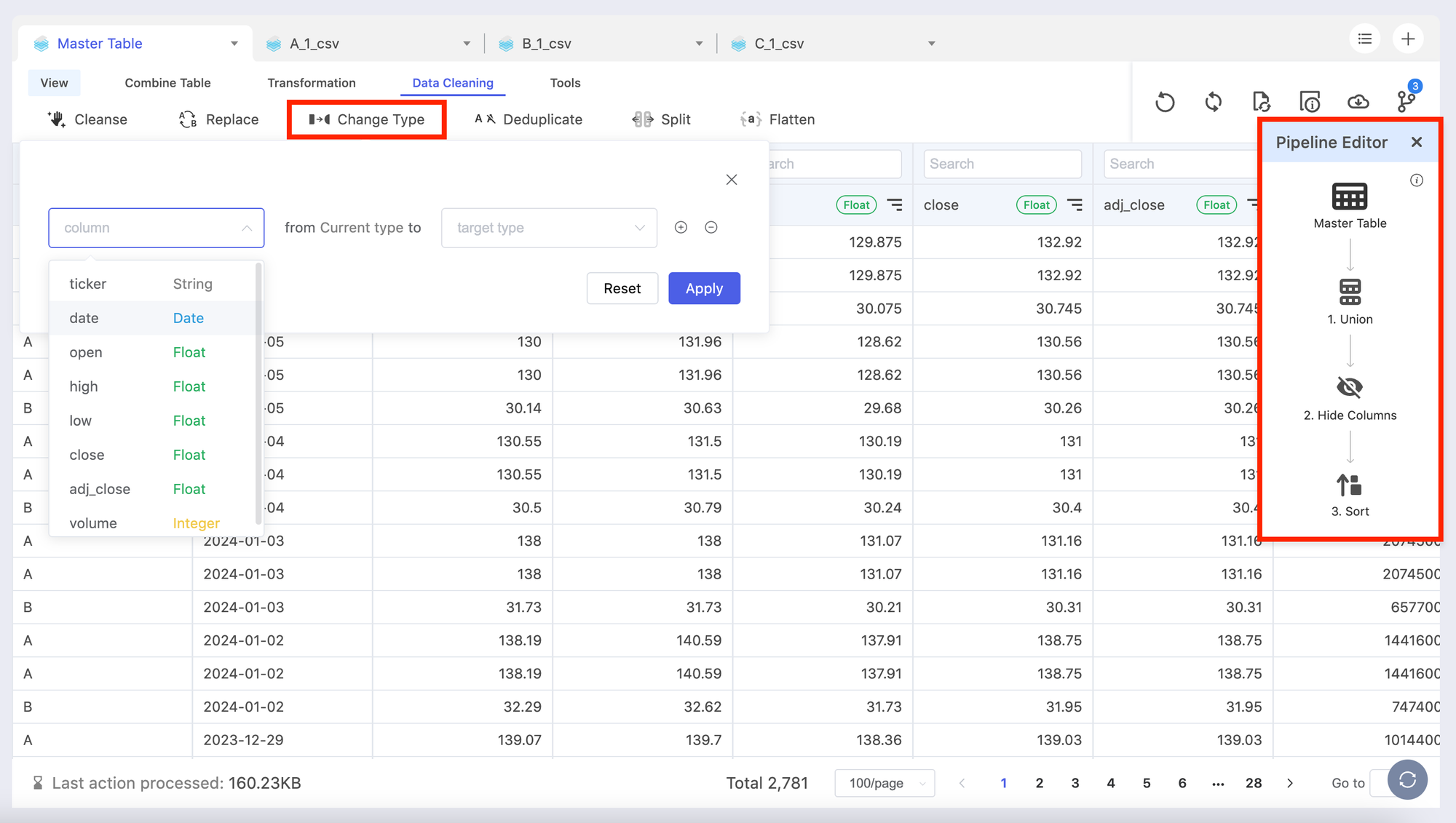 During this process, you can conduct a series a data manipulations such as hiding certain columns, changing the column names/types, and more so you can have a dynamically updated Master Table that can