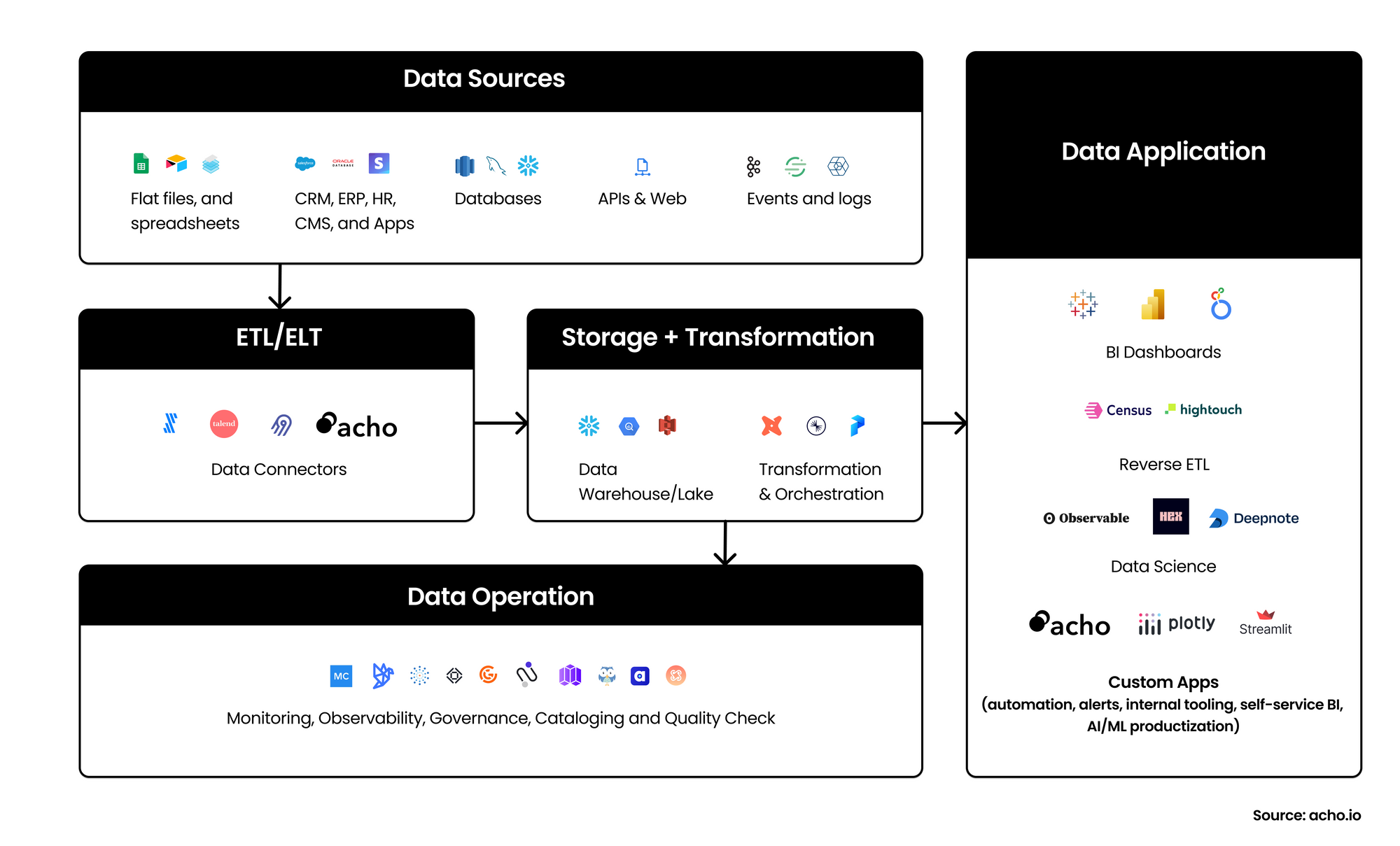 | Data Application | Productize data, provide services, and digitalize processes for teams. Examples include internal tools, automation, self-service BI, and AI/ML productization. | Acho, Streamlit, Plotly Dash |