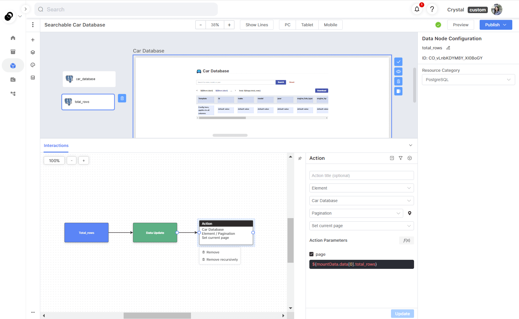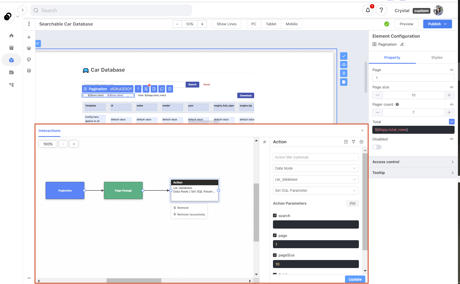 b. Next, navigate to the interaction panel and add an action to send the total number of rows to the pagination element.