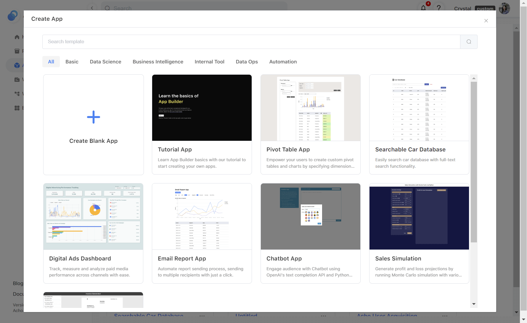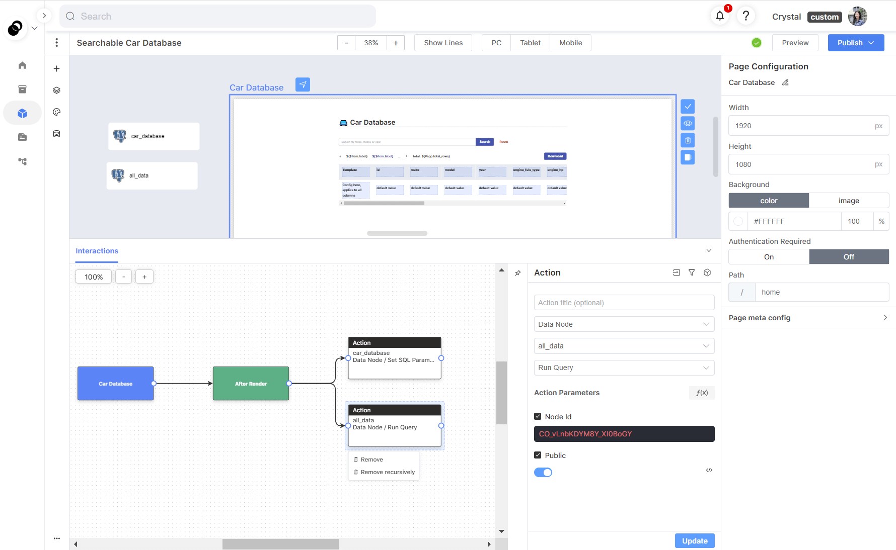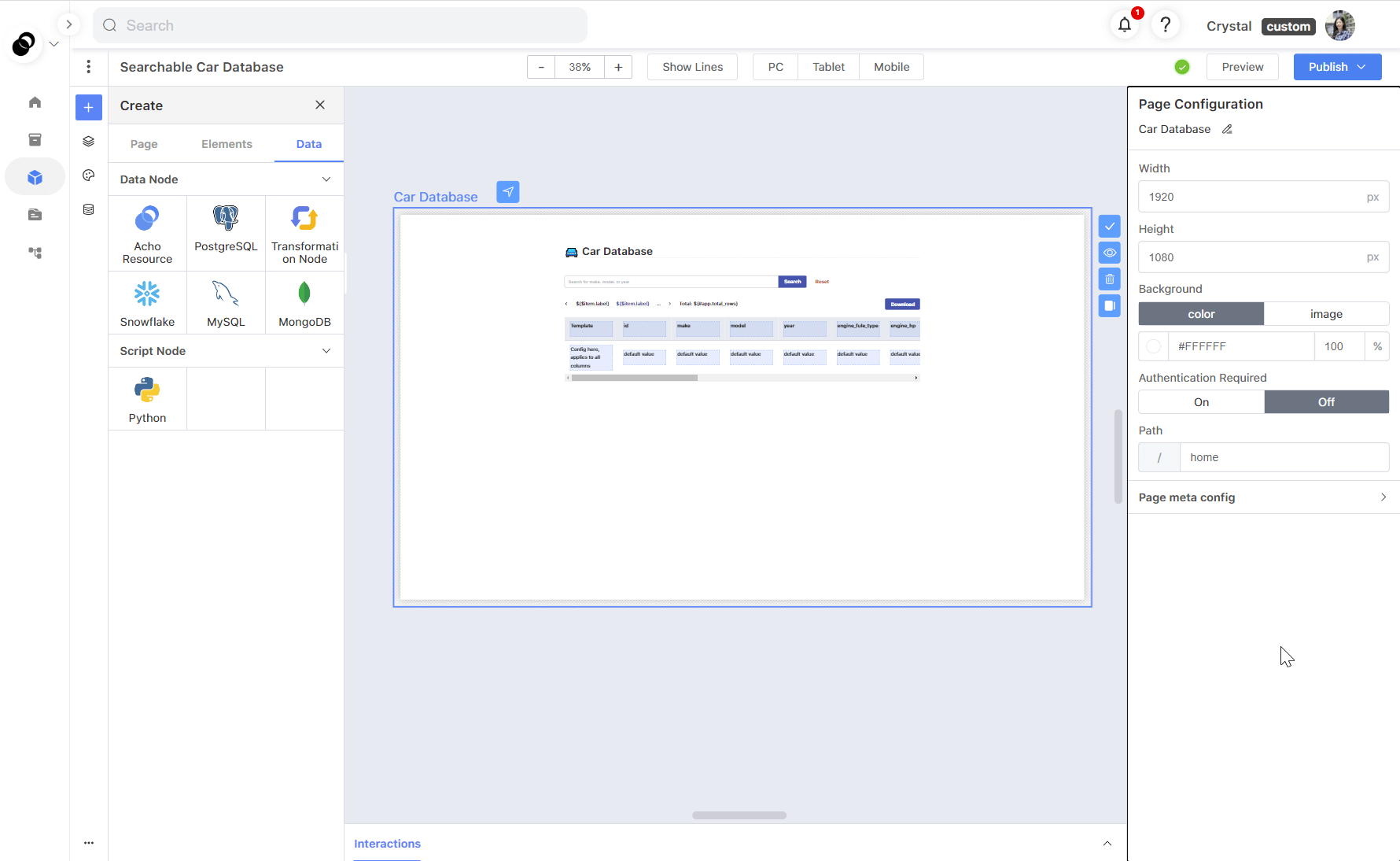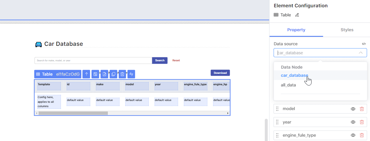 After successfully setting up your data source, you can navigate to the “App Builder” page and create a new app. You can create a blank app and follow the instructions to create a web app database. Alternatively, you can save time by choosing the "Searchable Car Database" template and replacing the existing database with your own.