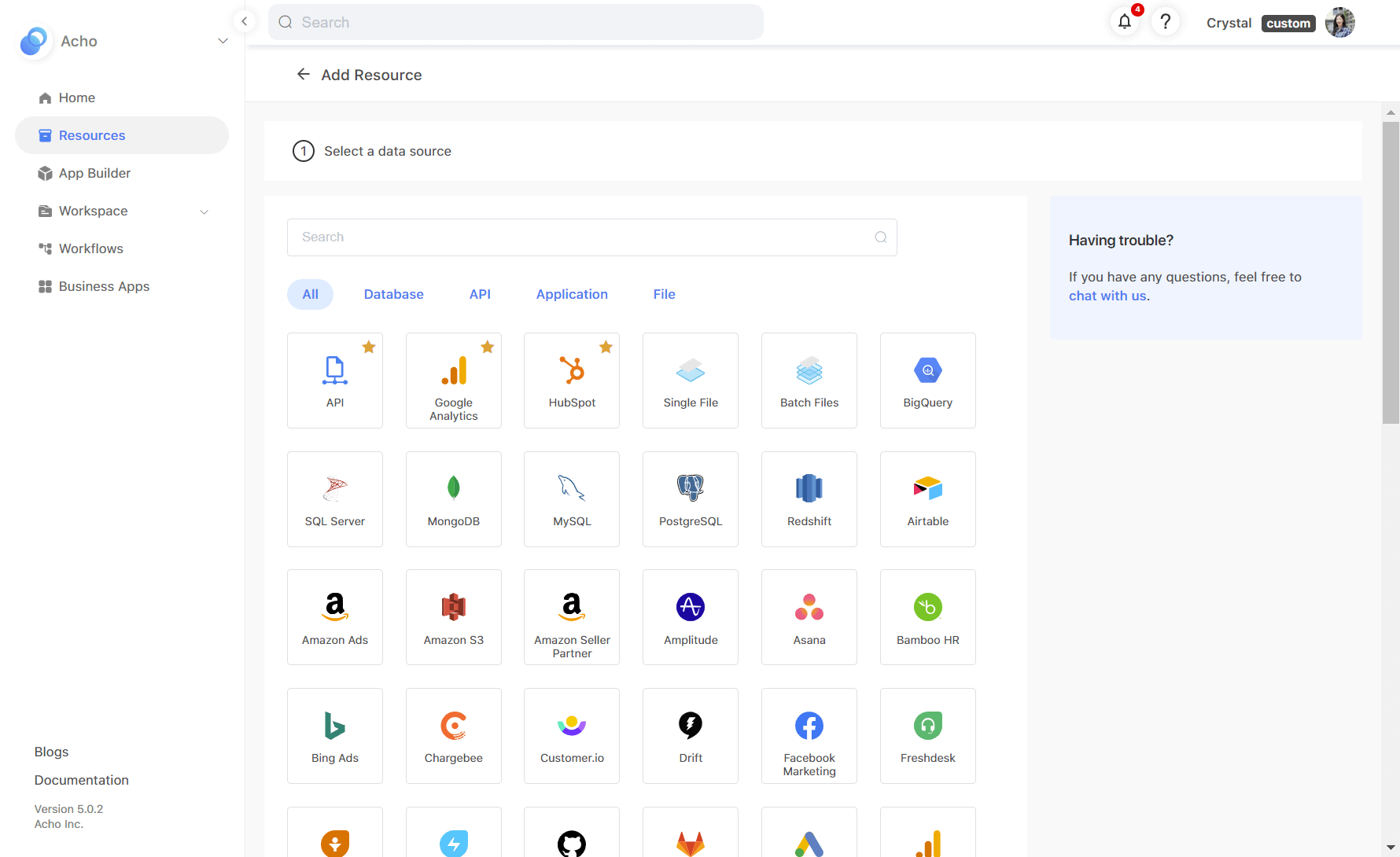 However, if you do not possess a database and your data is stored in CSV files or other third-party platforms like Google Ads or HubSpot, you can either upload the files or connect to the third-party platforms via an API connector. Acho automatically constructs a database for you, so you won't have to start from scratch.