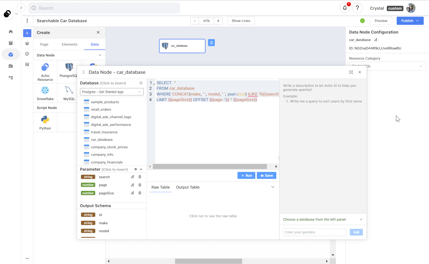 To import a data source to your app, navigate to Create > Data on the left panel and drag the “Acho Resource” data node to the canvas. Then, double-click on the data node and write a query below to retrieve all the data: