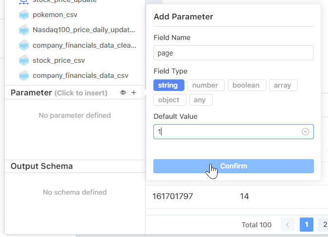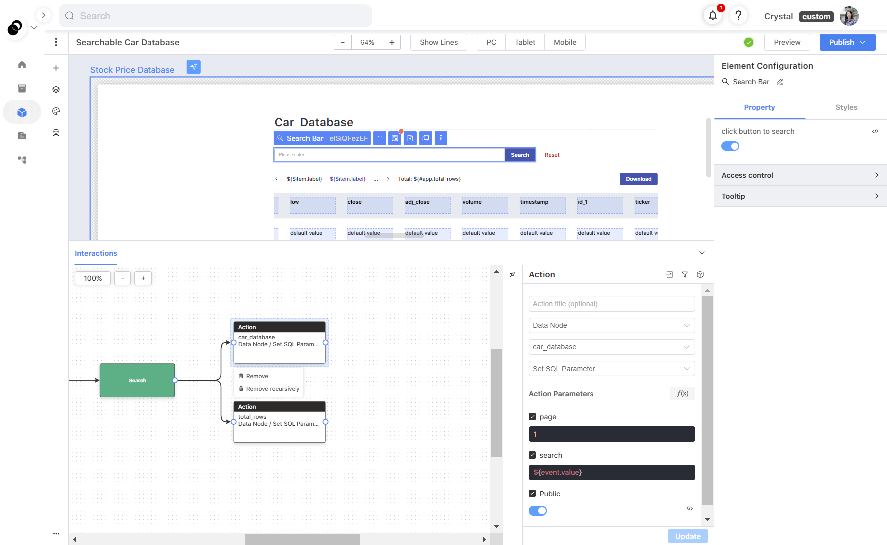 First, open your data node and create a string parameter named search. Then, add a search statement to your query as shown below, which allows users to search for any ticker's price: