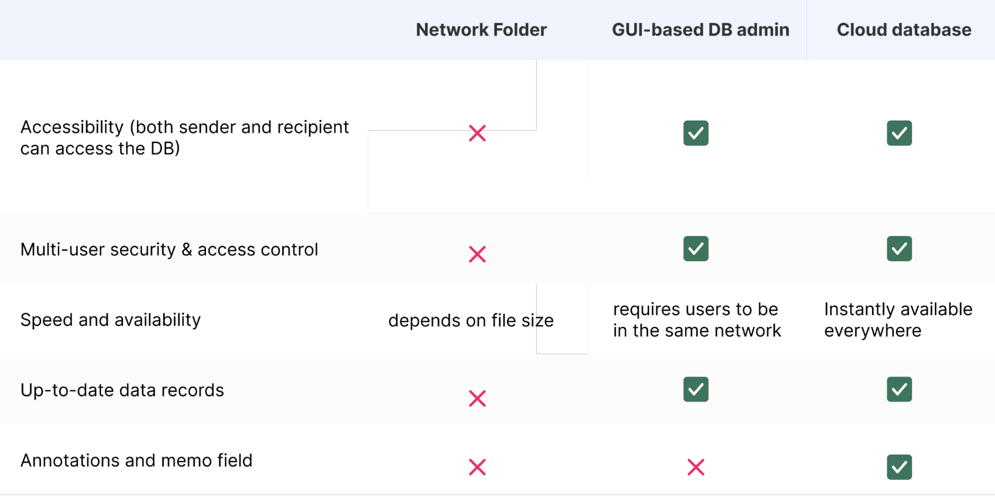 Below is a table that compares database sharing via 3 different methods covered in this article: