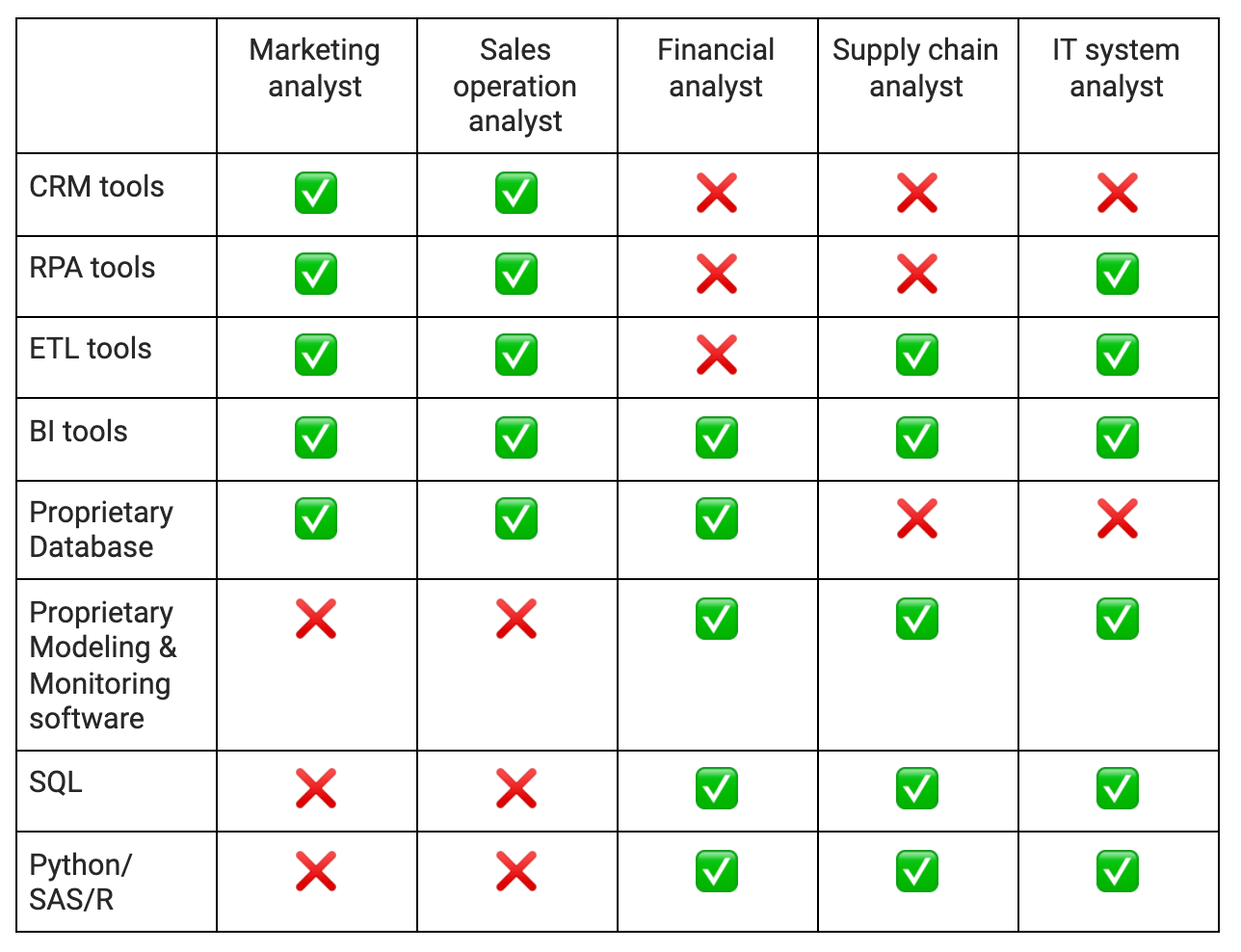 Based on our research on over 3000+ analysts across industries, analysts with different titles and job functions tend to use many different tools. The sales and marketing analysts for example require more automation tools and proprietary databases while the financial, supply chain and IT analysts rely more heavily on data modeling tools. There is one tool however that all analysts use, and that is Business Intelligence tools for reporting.