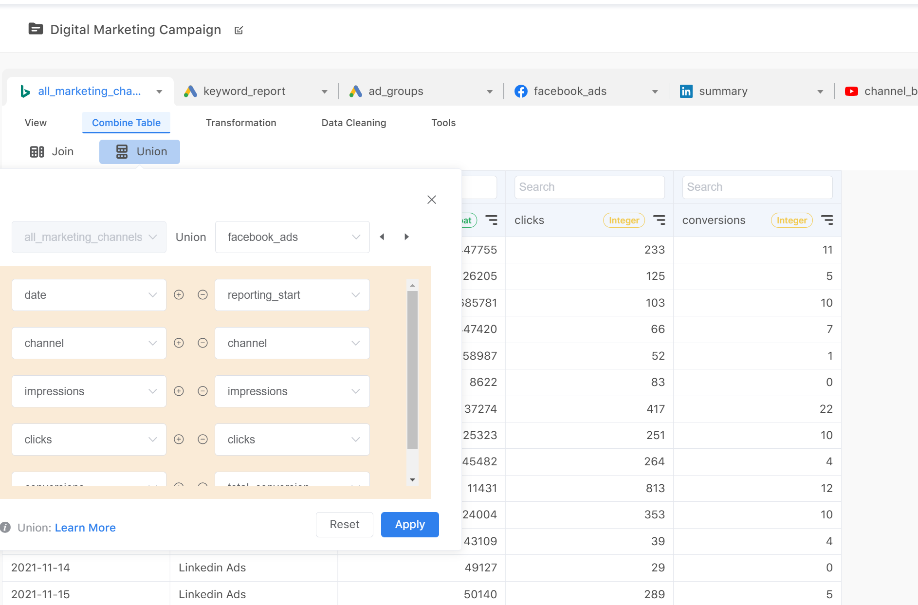 Another situation is that your data comes from different data sources but has similar information. In our case, we run multiple marketing campaigns on different platforms, and all of these platforms share similar data fields, such as clicks, impressions, or conversions. Combining these tables into a single table can help us to compare the performances of different channels in BI tools