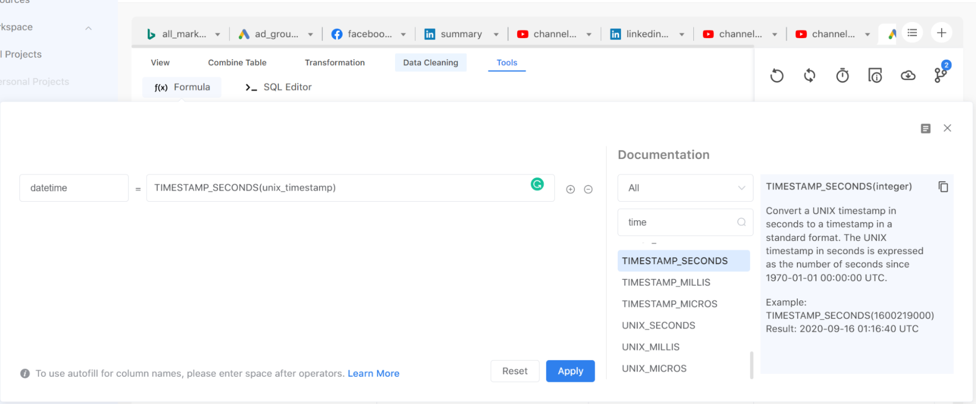 For example, if a date and time column is displayed in a UNIX timestamp, such as “1658435238”, you should turn it into a human-readable format, such as “2022-07-21 20:27:02”. In this case, you can use the “Formula” action to change the display format.