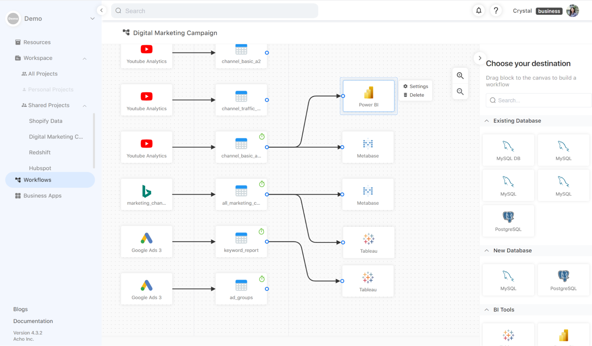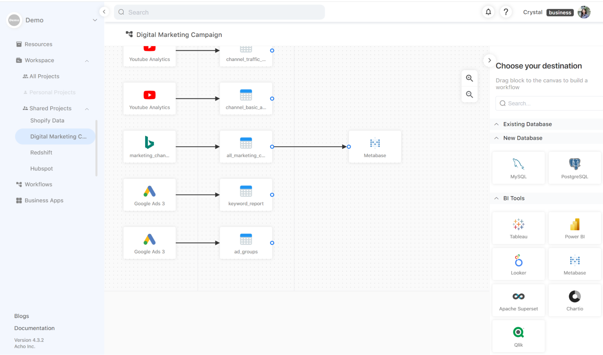 In Workflow, you can send data to other BI tools by dragging a BI tool node to the canvas and linking the table to the node. If it’s your first time exporting data to a BI tool, you have to follow instructions to set up a connection in your BI tool. Once the connection is set up, some BI tools (such as Metabase) can retrieve data from Acho tables automatically.
