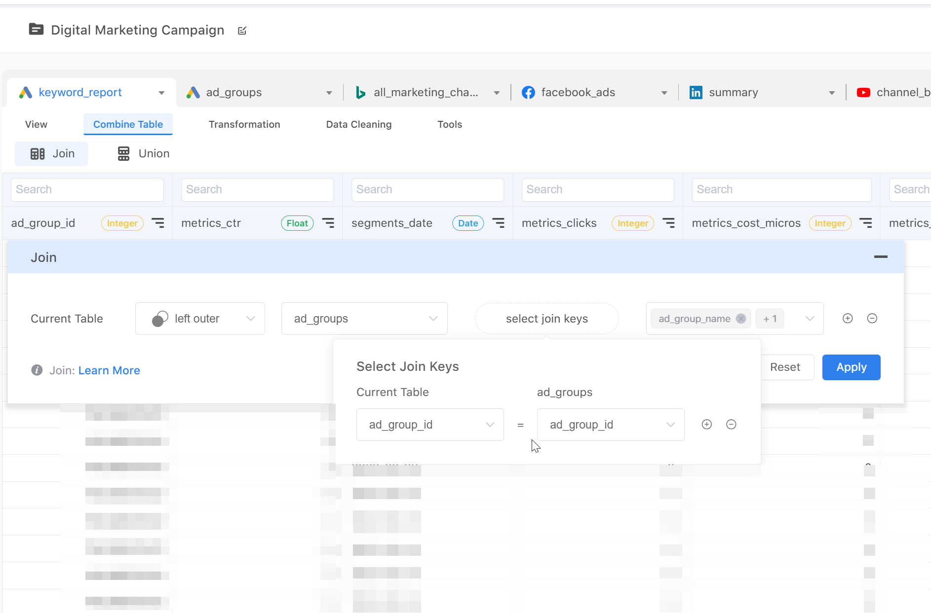 Generally, to optimize storage efficiency, data is normalized into several tables and stored in relational tables. That is, you have to combine multiple tables to get complete information. In the following example, the “keyword_report” table in Google Ads has a “ad_group_id” column, which allows you to identify which records belong to which Ad group. However, you don’t know what these groups are. Thus, you have to join the “ad_groups” table to get each Ad group’s name.