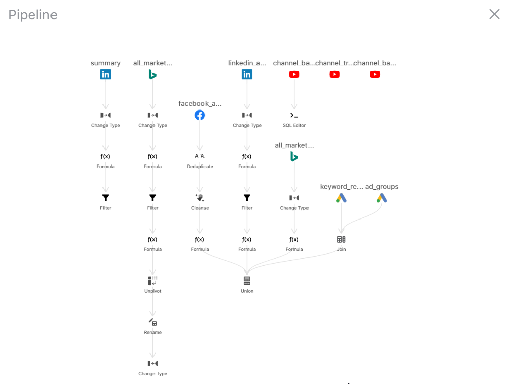 After finishing data cleaning and transformation, you should check all actions you applied by clicking the “Pipeline” button. Pipelines present the transformation history and the relationships between tables in a network diagram. This can help you avoid applying repeated actions or forgetting to combine some of the tables together. Also, when some errors happen, it’s useful to debug or find out the issues in the pipelines.