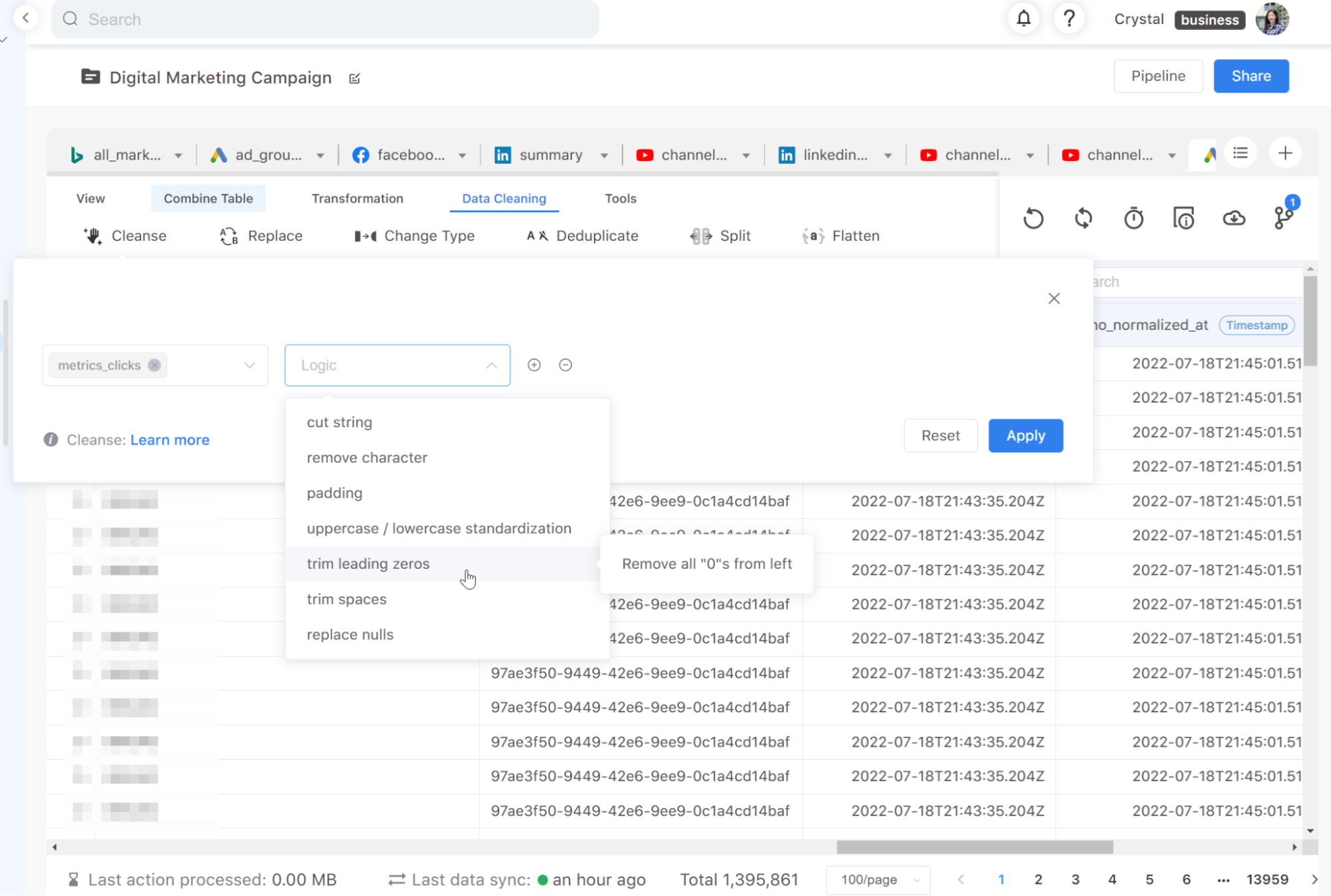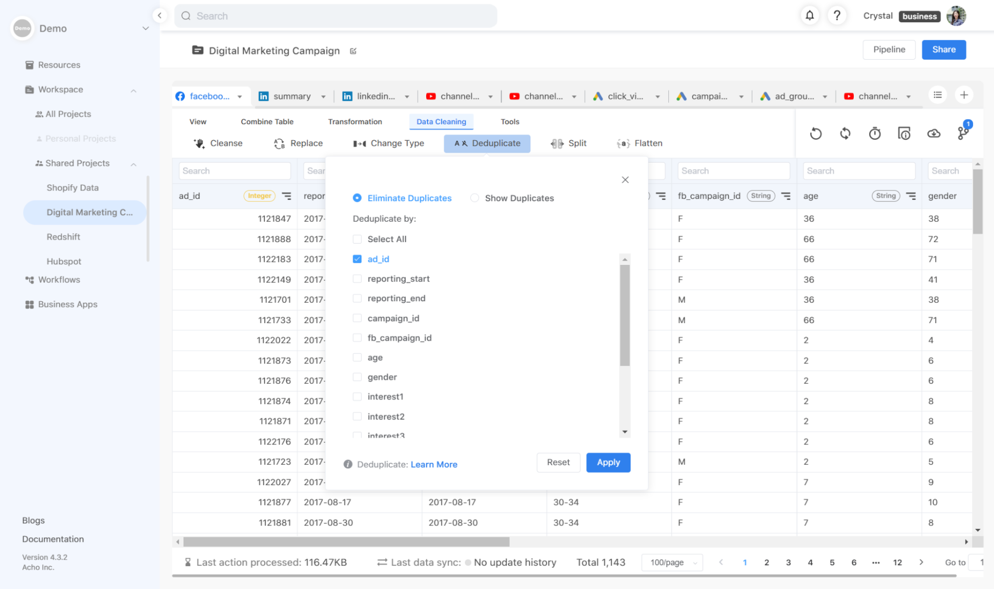 In this article, we’ll use a digital marketing dashboard as an example to demonstrate how to preprocess your data on Acho.