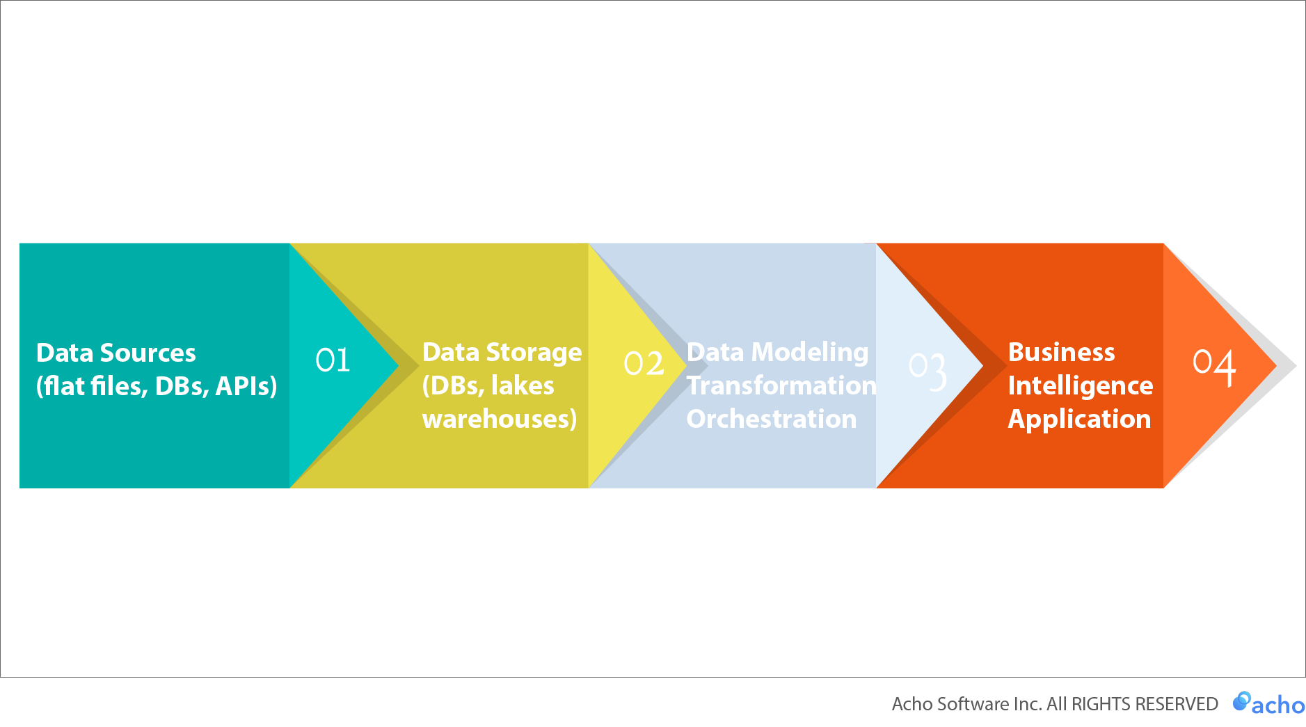 Modern BI dashboards can “talk” to relational databases directly. This means that they are great for retrieving readily available data and visualizing it for consumers. However, raw data requires data preparation as we discussed. Even though data can be processed and prepared within a data warehouse or lake, it’s useful to have a “semantic layer” that replicates and indexes existing data from the warehouse for supporting BI applications. The below illustration shows how the workflow can function as a well-managed pipeline for supporting BI applications.