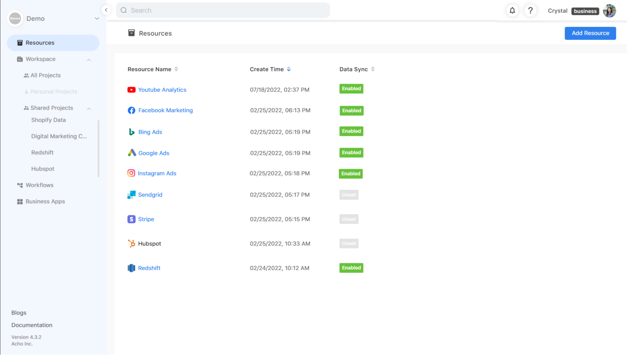 On Acho, you can add a resource on the Resource page and follow the instructions to connect the data source. Once the connection is set up successfully, you may need to wait for several minutes to retrieve data.