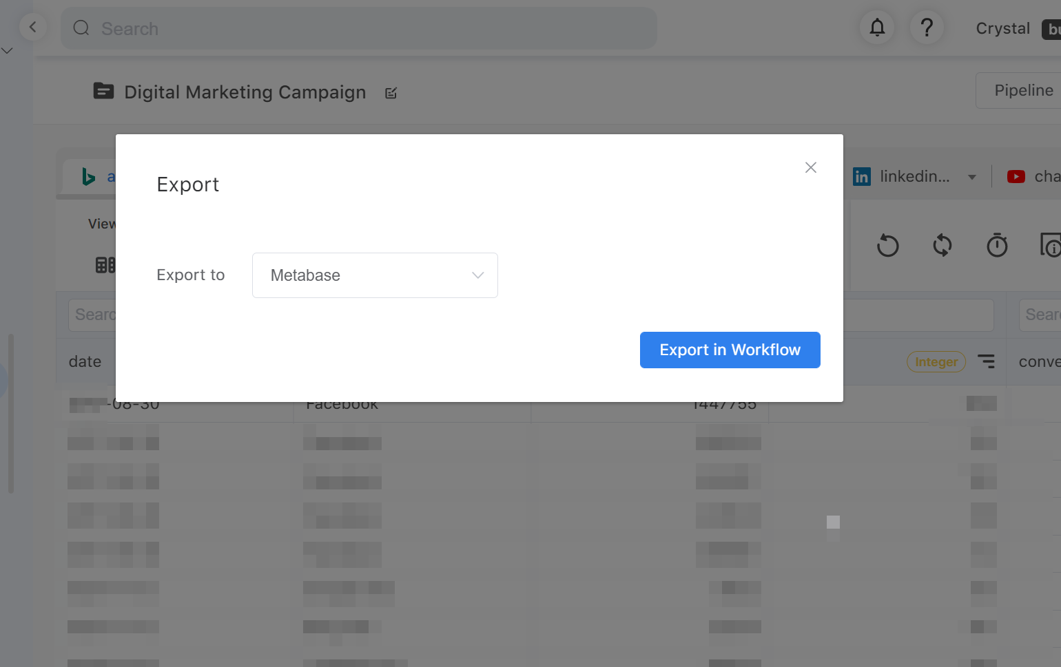 Once all your data is ready, you can start exporting them to a BI tool. You can go to the table you want to export and click the “export” button on the toolbar. Then, it will bring you to Workflow.