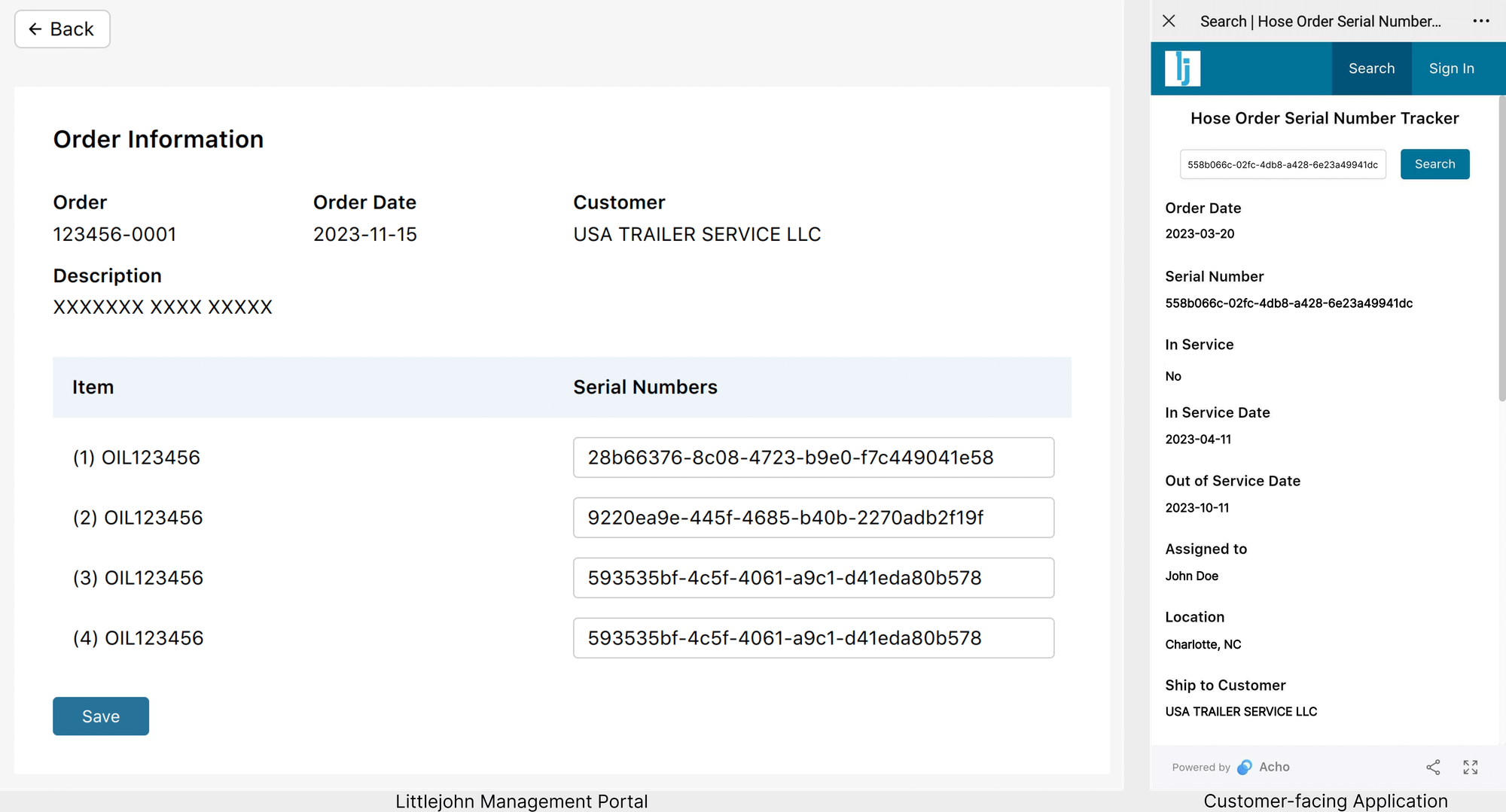 In Littlejohn’s specific use case, a gap emerged between internal customer-related data and the actual customer experience. The company identified the need for an efficient method to record serial numbers for ordered items and provide customers with visibility into their purchased items. Recognizing the limitations of the ERP system, Littlejohn opted to customize applications to meet specific requirements. This decision was driven by the realization that traditional ERP systems might not provide the necessary flexibility. Littlejohn reached out to us, acknowledging our capability to integrate data from various applications and construct fully customized solutions tailored to their unique needs. This approach empowers Littlejohn with the agility required to overcome the constraints posed by conventional ERP systems, ensuring a more tailored and effective solution.